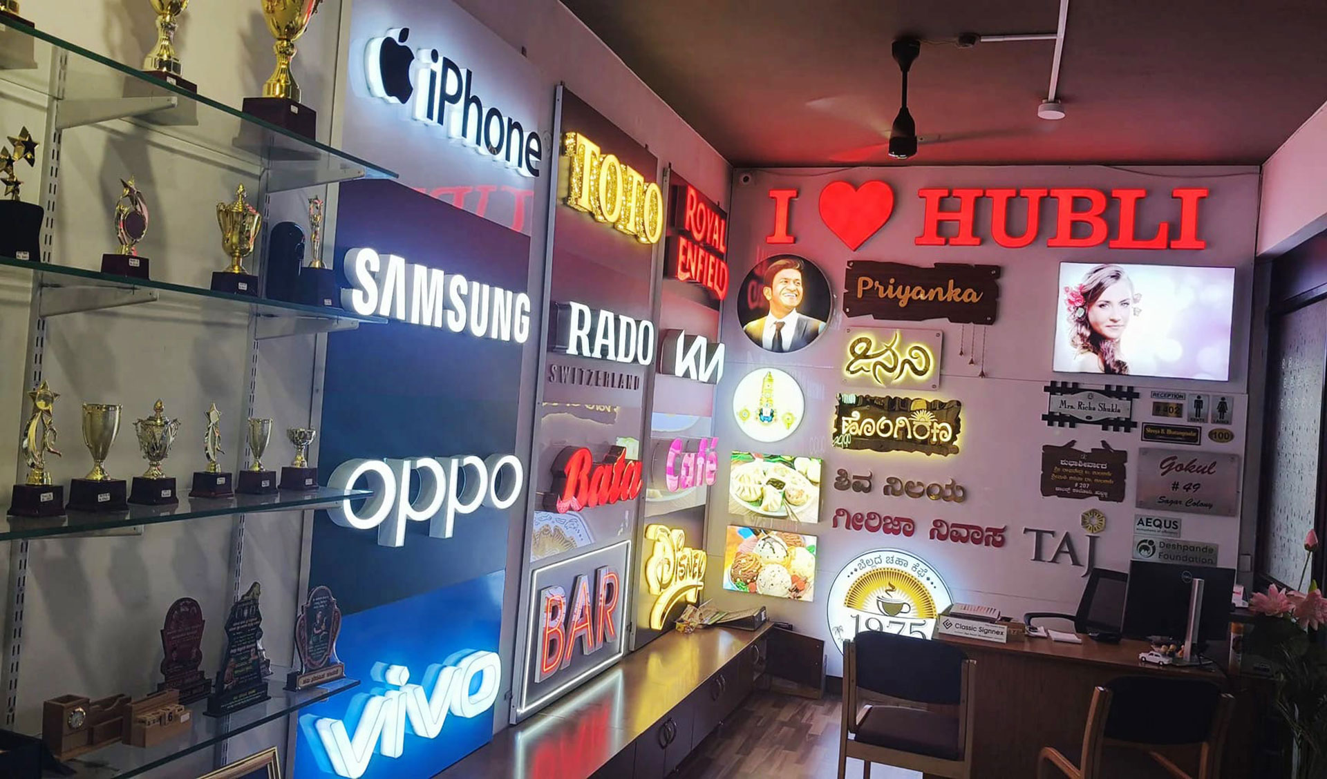 Based in Shreya Nagar, Vidya Nagar, Hubballi, we are trusted manufacturers of custom sign boards tailored to suit your brand's identity. Our product range includes Acrylic Channel Letters, Foam Letters, In-shop Branding, Glow Sign Boards, ACP Glazing, Steel Letters, Titanium Letters, House Name Plates, Aluminum Channel Letters, Lip Letters, and Liquid Channel Letters.